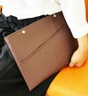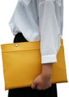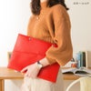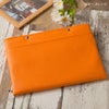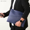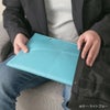 クラッチバッグってなんか「デキル人」に見えますよね。それを意識してデザインしてみました。 ゴチャゴチャさせずにシンプルに、でも持った時に洗練されたように見える、そんなことを意識しました。 コレは男性でも女性でも同様に、格好良く爽やかに「デキル人」を演出してくれます。 そしてバッグインバッグとして使う場合、とにかくパソコンや書類、雑誌等をすぐ取り出したいじゃないですか? 一度バッグからコレを出して、その中からまたパソコンなどを出して・・・って、実際モノスゴク面倒くさい! なので上部に取り出し口を設けて、しかもファスナーではなく(大事なパソコンが傷つかない狙いもある)、シンプルにボタンが2つ。 このボタンをあえて開けておくことにより、驚くほどスムーズにパソコン等が取り出せます。 これは使ってみると本当に楽なのです。